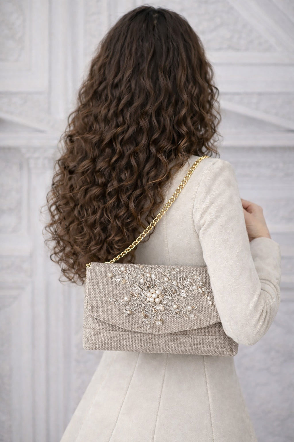 Die elegante Umschlagform und die goldfarbene Kette runden das Design stilvoll ab und verleihen ihr eine luxuriöse Leichtigkeit.