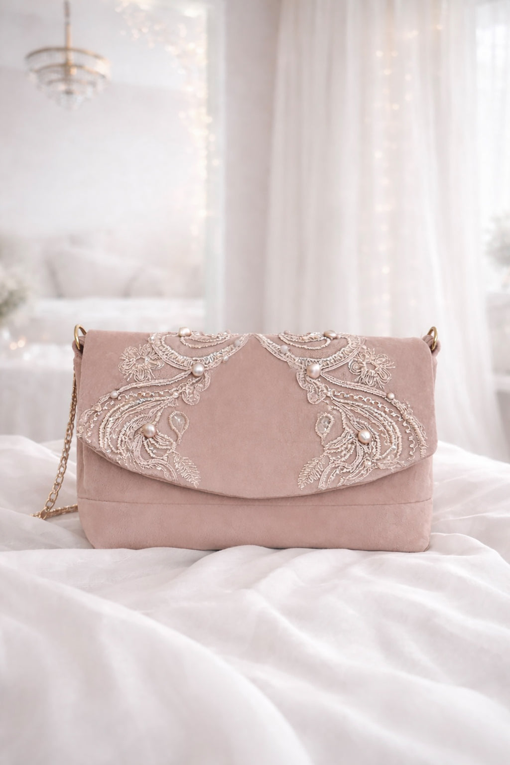 Velarosea – Designertasche in Rosé mit Paillettenspitze Kunzit und Süßwasserperlen
